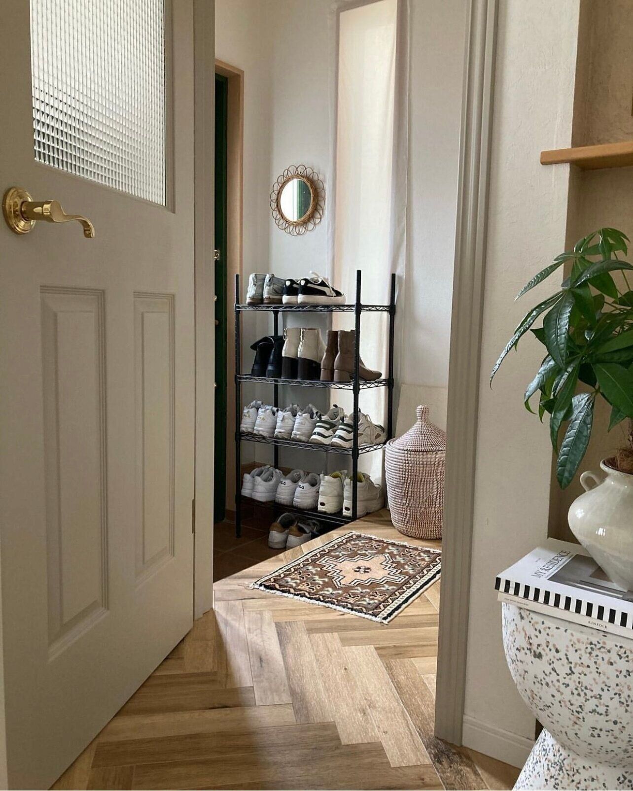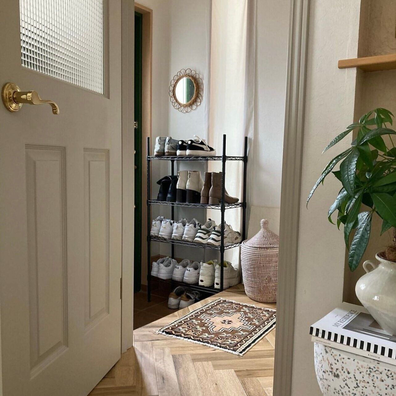 ☆akさんがニトリで見つけたのはスチールラックです。シューズラックとして使用しているようですが、玄関スペースにジャストサイズだったみたい。靴が整頓されていると気持ちいいですし、踏んづけたりして靴が傷むのも防げますね。