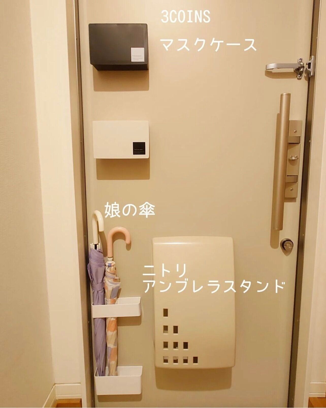 sumoさんがニトリで購入したのはマグネット式のアンブレラスタンド。磁石がつくタイプの玄関ドアにペタッと貼りつけるだけなので設置も簡単ですね。置き場所に困る傘も定位置が決まり、玄関まわりがスマートに。