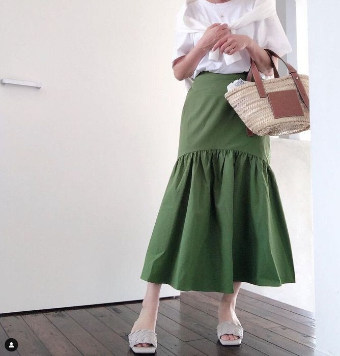 月子さんは、ドルマンTとUVカットクルーネックカーディガンを購入。綺麗な色味のグリーンスカートと合わせてみたんだとか。カーディガンを肩に羽織ることで、首元の日焼け防止にもなりそうですよね。着てもいいし、肩にかけてもいいし、使い勝手も抜群なカーディガンですね!