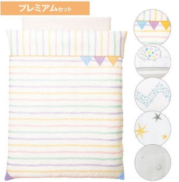洗濯機で丸洗いできる体圧分散の敷き布団2枚と掛け布団がついたベビー布団セットです。汗取りシーツ×2枚や専用の洗濯ネットなども含む便利な10点セットで、買い足す心配がいりません。柄はスーパープレミアム同様に5種類あります。