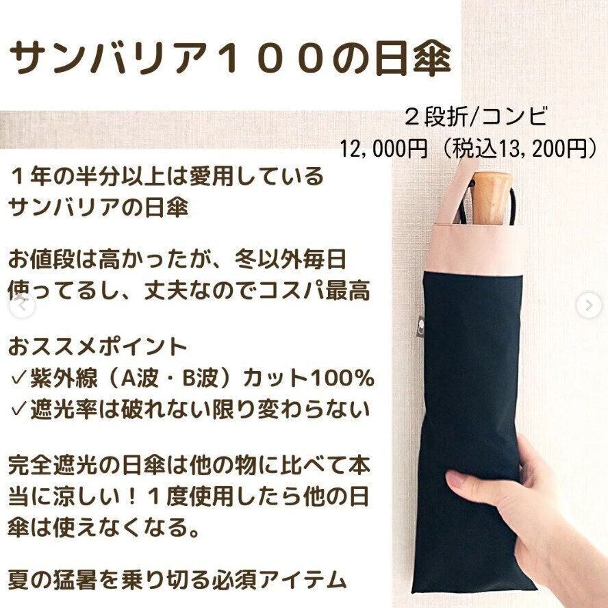 miki_kurasiさんは、サンバリア100の2段折 / コンビ折りたたみ日傘(13,200円)を購入。お値段は高めだけど、冬以外は毎日使っているし、丈夫でコスパも最高とのこと。完全遮光なので他のものと比べても格段に涼しく、一度使用したらほかの日傘が使えないほどなんだとか。注目の日傘ですね!