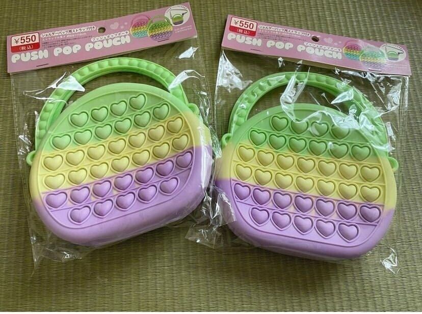 mikan.mayoさんがプッシュポップが好きな娘さん2人のために、キャンドゥで購入したのは、プッシュポップポーチ。550円商品ですが、ショルダーバッグ用のストラップがついていてカバンとしても大活躍しそうですね♪