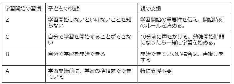 このように『Z=できない』から『A=上手にできる』の間に、『B』『C』の目盛りを設けて考えるのです。たとえば、『毎日決まった時間に学習を開始できる』という学習習慣を例にとって考えてみましょう。