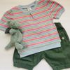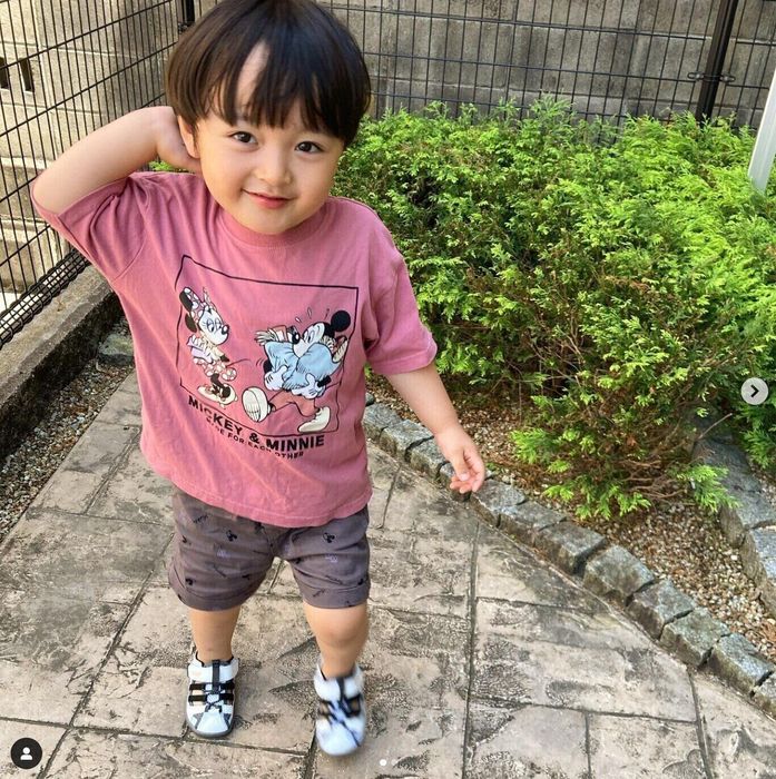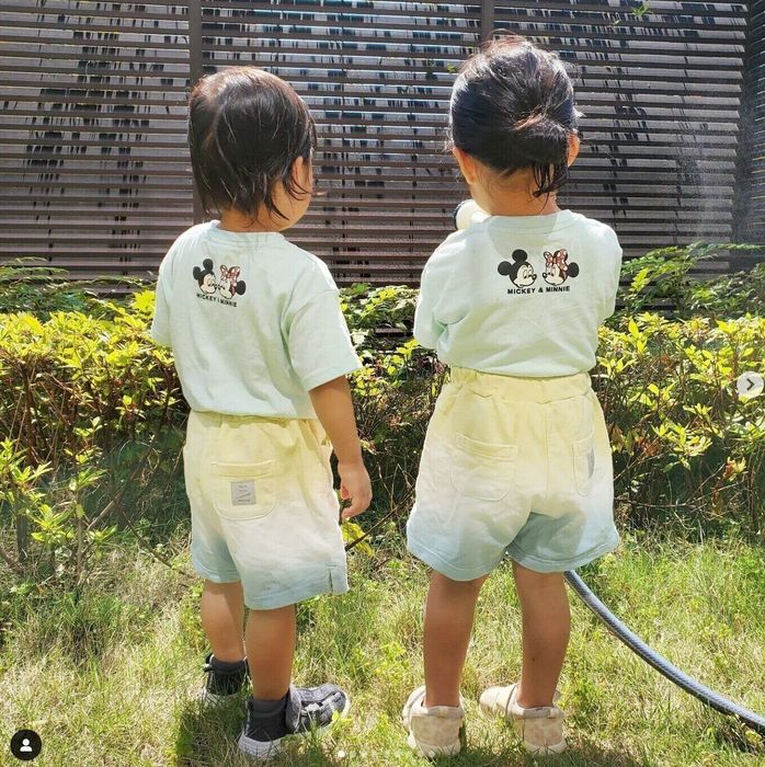 EMMA & SASUKEさんは双子でお揃いコーデ♪ LITTC(リトシー)のトップスに鮮やかなズボンの色合いが夏らしいですよね!背中のミッキー&ミニーがとても可愛らしく、バックプリントまでおしゃれなのは魅力的ですよね。