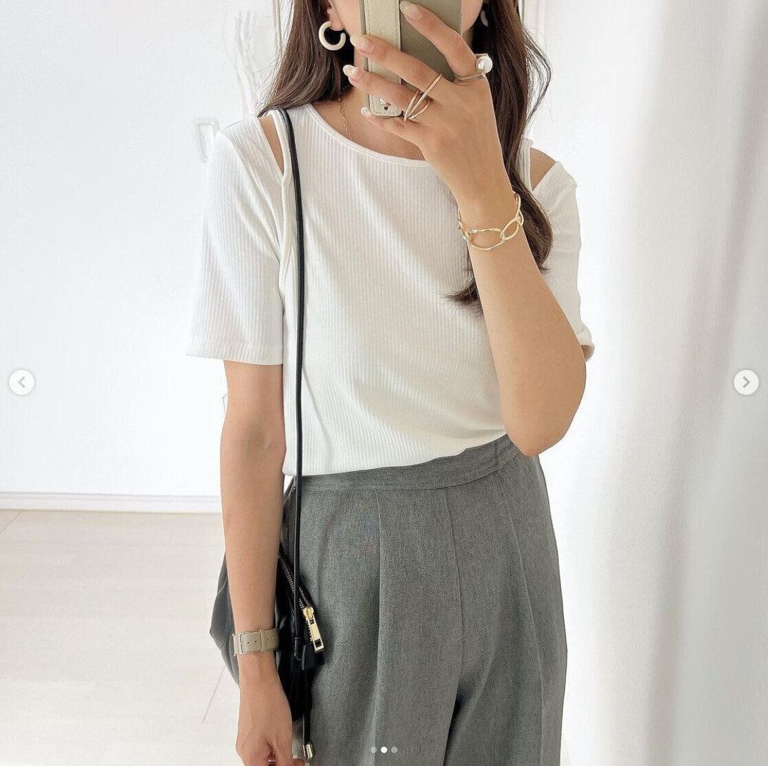 着回し力もあって最高」とのこと。ほかにも色違いで欲しくなるほどお気に入りなんだとか。肩部分のほどよい開きや、リブ感が可愛らしいTシャツですよね。
