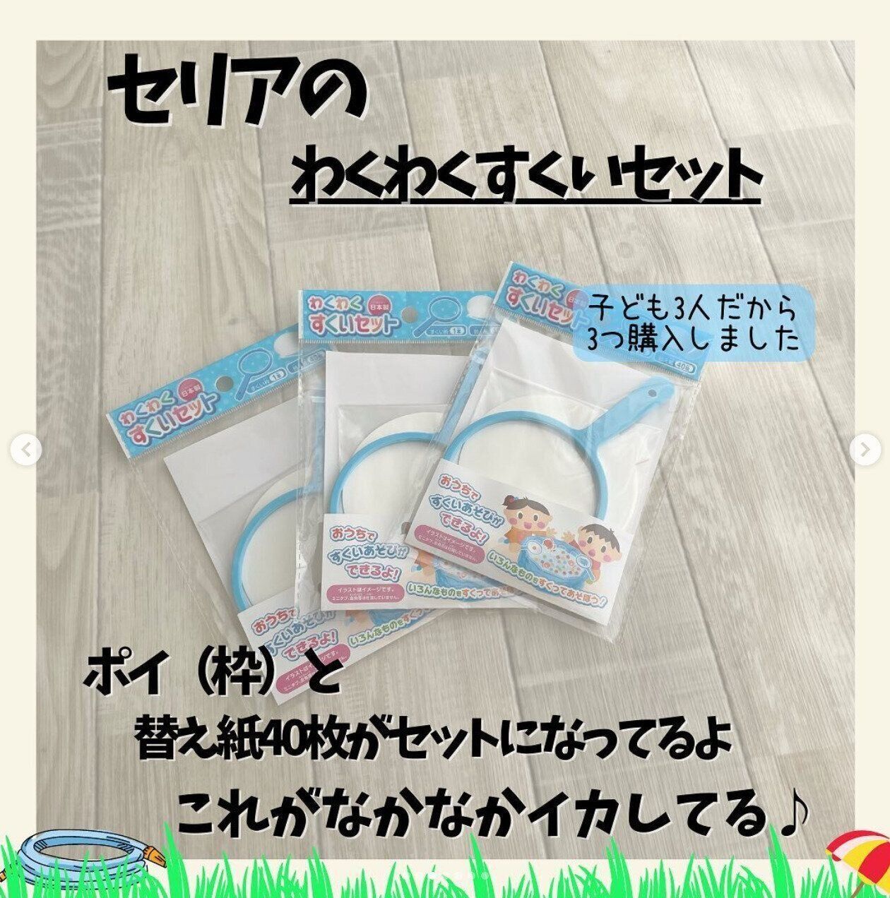 こちらは、rimaru_5さんがセリアで見つけた「わくわくすくいセット」。枠と替え紙40枚がセットになっているようなので、何度も遊べるのがうれしいですね。おもちゃの金魚も購入して、おうちでお祭り気分を楽しんでいるとのこと♪