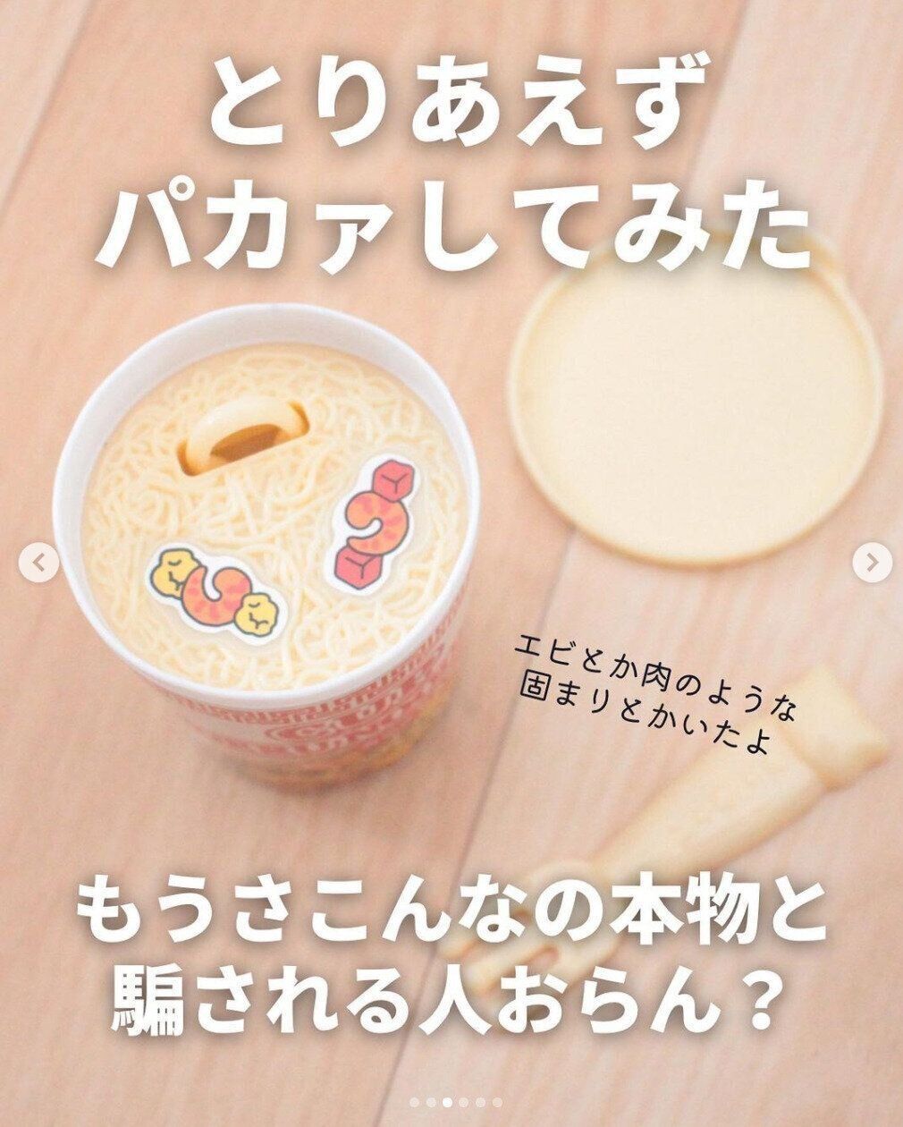 こちらは、mitapan_0306さんがセリアで購入したカップでるヌードル。ふたを開けるとおもちゃの麺が入っていて、フォークですくうこともできるんだとか。パッケージもリアルで、おもちゃとは思えないクオリティですよね!
