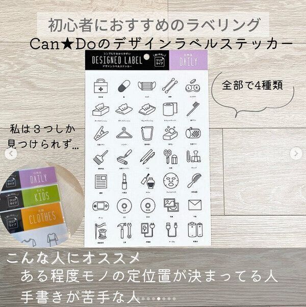 Rokoさんがキャンドゥで購入したのはデザインラベルステッカー。日用品や子ども、衣類など、全部で4種類あるようです。イラストがかわいくてわかりやすいですね。細かく分類されているのもわかりやすそう!