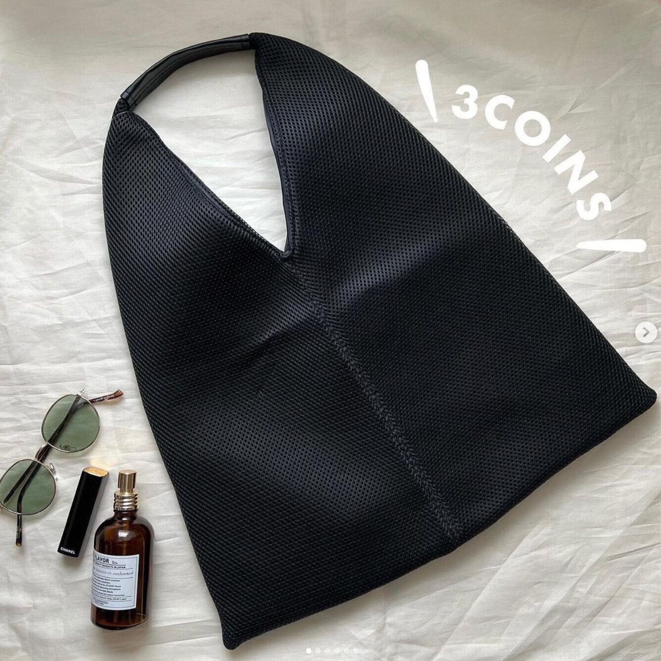 こちらは、konitanikoさんが3COINSで購入したメッシュトライアングルバッグ。張りのある生地で型くずれしにくそうとのこと。縦50cm、横45cmくらいと大きめサイズのようなので、荷物が多い人も使いやすそうですね♪ こちらは550円商品のようです。