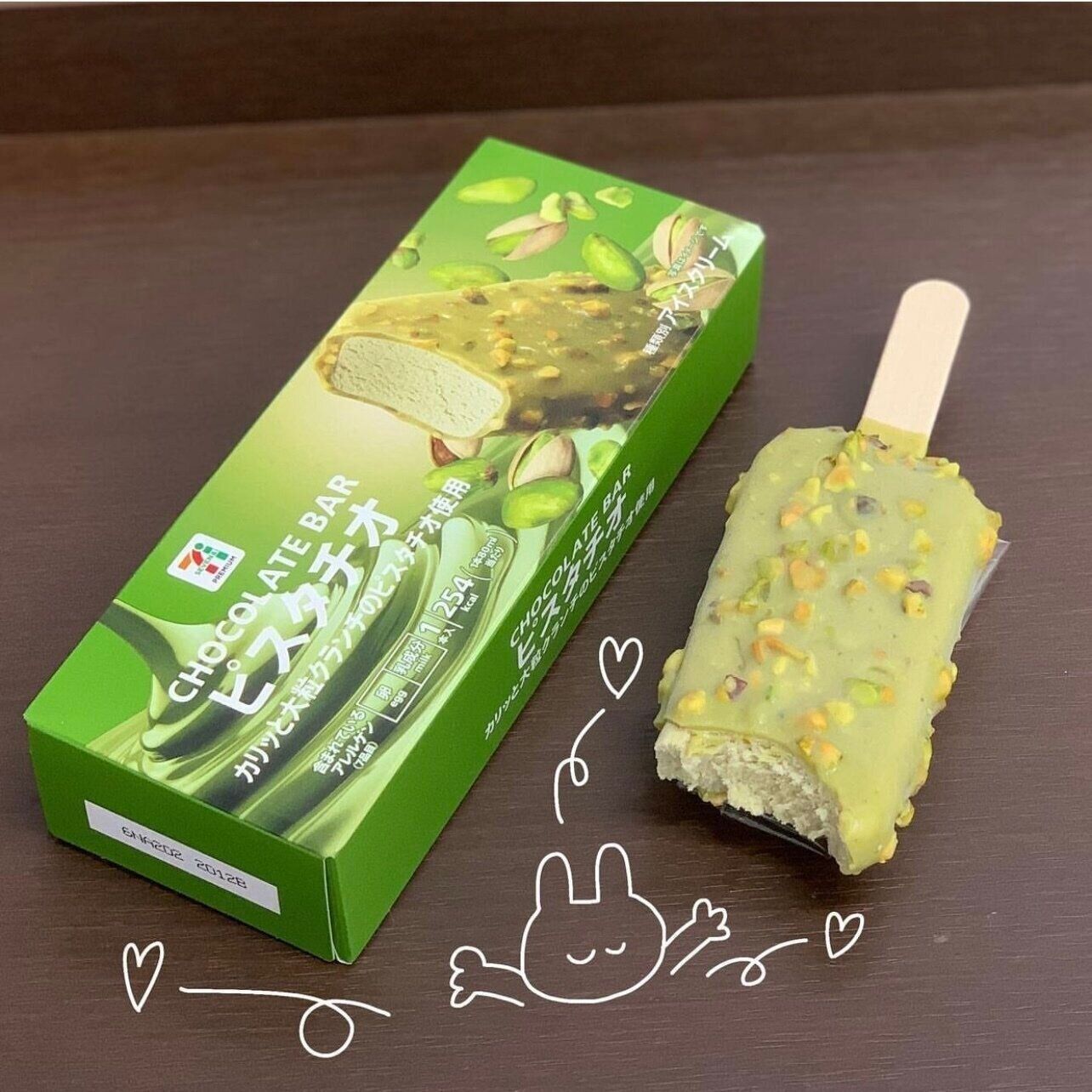 hinna___iceさんがセブンイレブンで購入したのは、ピスタチオのチョコレートバーです。ピスタチオアイスを包んでいるチョコレートコーティングには、大粒のピスタチオクランチがザクザク。アイスやチョコレートの甘味にナッツの塩味がプラスされて絶妙なおいしさなんだそう。