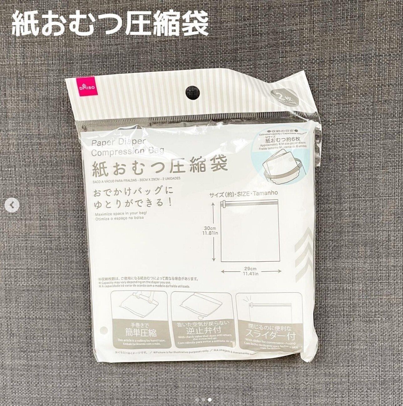 pon momさんはお出かけの際にダイソーの「紙おむつ圧縮袋」を使っているそう。紙おむつ約6枚分を簡単に圧縮できるそうで、コンパクトにまとまるのがとても便利なポイントとのこと♪