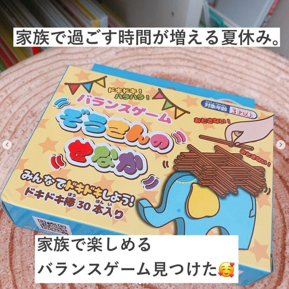 うに子さんは、バランスゲームの「ぞうさんのせなか」を購入。ぞうさんのおもちゃに細い棒を乗せて、棒を落とさないようにバランスをとるゲームなんだとか。家族で過ごす時間にもピッタリ!ワイワイ楽しめそうなゲームですよね。