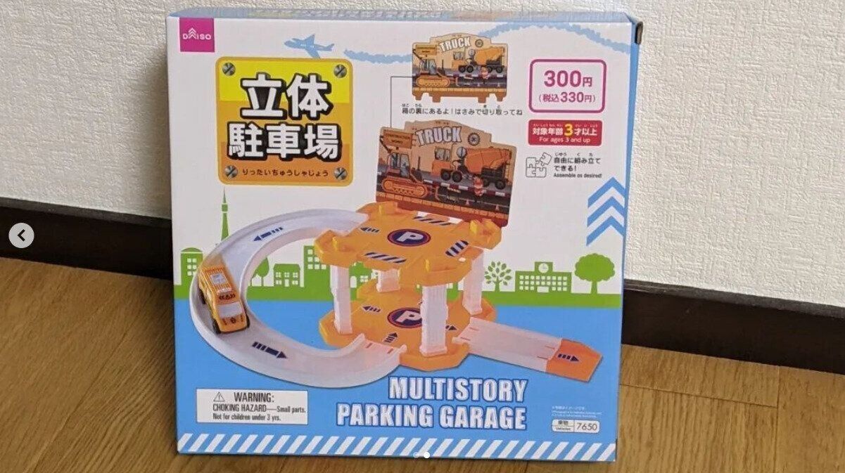 aya-puuさんは、こちらの立体駐車場330円を購入。同じ立体駐車場を4つゲットし、くっつけてみたんだとか。全部縦に積んでもOKで、形は自由に変えられるそうですよ。黄色い車は一箱に1つ付いており、軽いのでしっかりスロープを滑ってくれるんだとか。自由に組み立てて遊べるのが良いですよね。