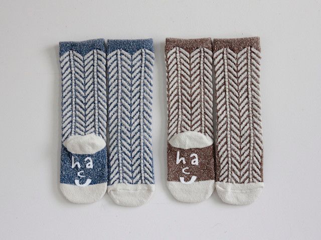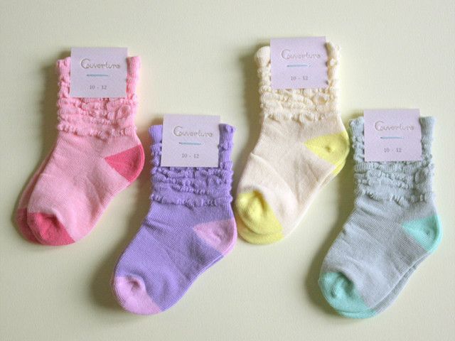モコモコっとした編み方で優しい履き心地の靴下。履き口にゴムを入れていないゴムなしタイプだから、柔らかくデリケートな赤ちゃんの足を、締めつけずやさしく包み込んでくれます。赤ちゃんのむちむちした足に、もこもこシルエットがたまりませんね♪