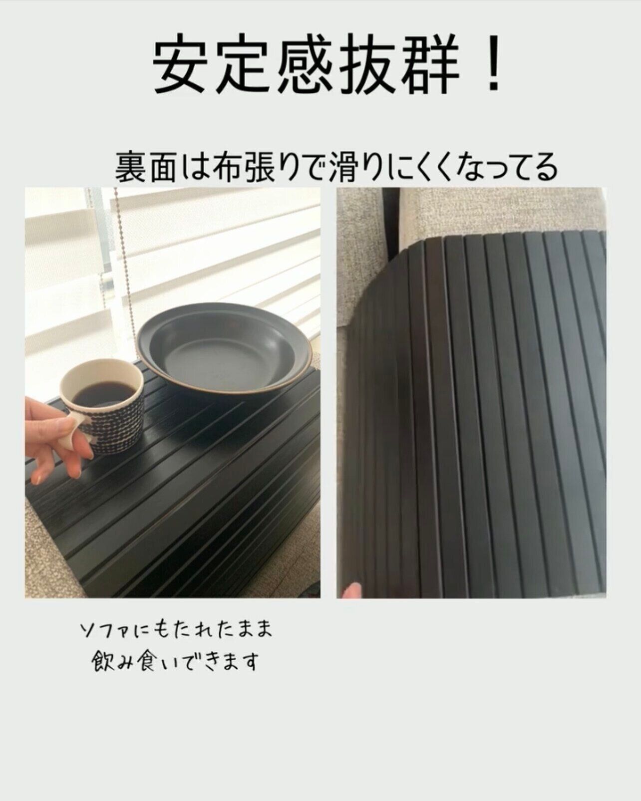 さぬさんがIKEAで購入したのは、ソファのひじ掛けにかけて使うアームレストテーブルです。すべりにくいうえ安定感抜群なので、テーブルがなくてもコーヒーのちょい置きなどができちゃうみたい。アウトドアソファでくつろぎながら、ドリンク片手に読書などの趣味を楽しめそうですね。