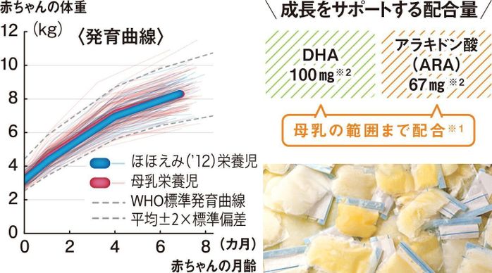 「明治ほほえみ」は、独自の研究により、一つ一つの成分を母乳に近づけています。赤ちゃんの発育に大切な栄養素DHAとアラキドン酸の量を母乳の範囲まで配合※2し、腸内のビフィズス菌を増やす作用があるフラクトオリゴ糖も配合。20万人以上の発育調査により「明治ほほえみ」だけを飲んで育った子と母乳で育った子が、同等に発育することを確認しています。粉・キューブ・液体すべて同等の設計なので、安心して使い分けられます。