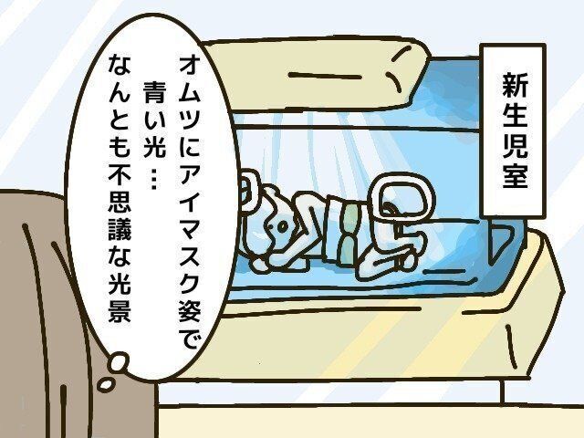 そんな中、黄疸の値が高くて保育器に入ることになったと看護師さんから聞き、見に行くとオムツ姿でアイマスクをつけて青い光を浴びている息子がいました。