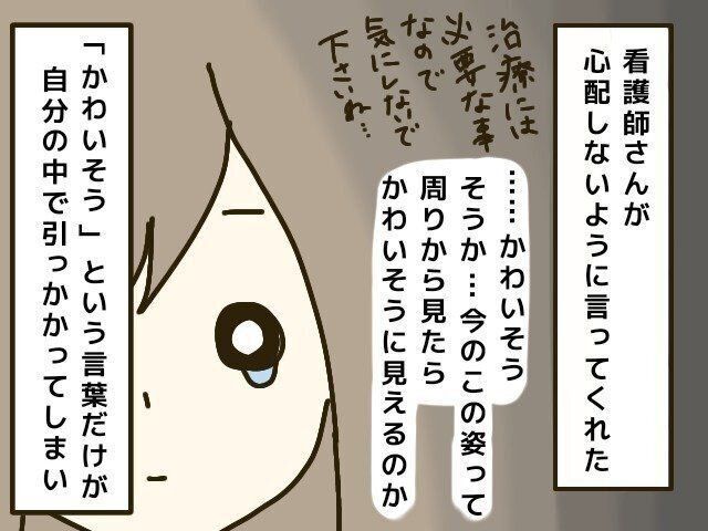 「すごい格好で治療してるなー」と不思議な気持ちで見ていた時に、私が気にしすぎないようにと、看護師さんが言ってくれた「かわいそうに見えるかもしれない」という言葉。