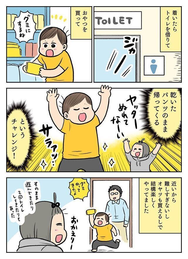 こげのまさき「外のトイレを使う練習と『パンツでお散歩しても大丈夫じゃん!』という成功体験が積めればいいなと思ってやっていました。本人もついでにスーパーでオヤツを買えたり、楽しんでできたのが良かったかなと思います」