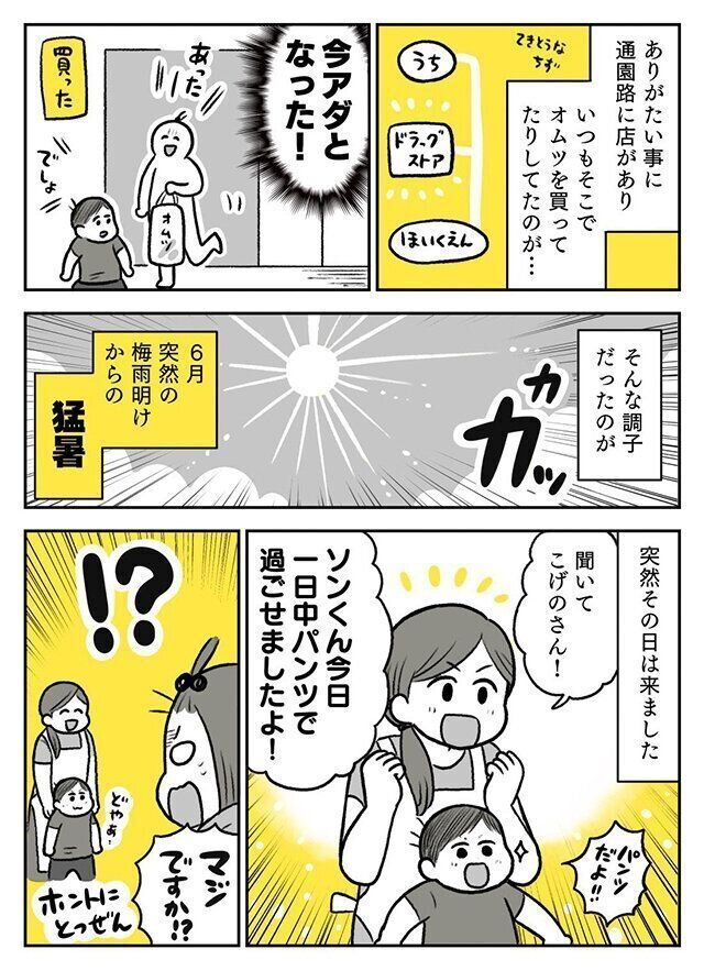 こげのまさき「保育園の先生がおっしゃった通り、オムツをするとトイレに行かずにすむのが楽だったのかなーと思います。失敗するのを不安がっているのかな?という気もしたので、できないことを言わず彼の気持ちのタイミングで構わないと思っていました」