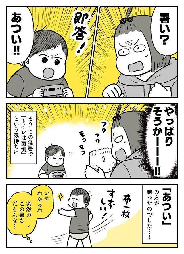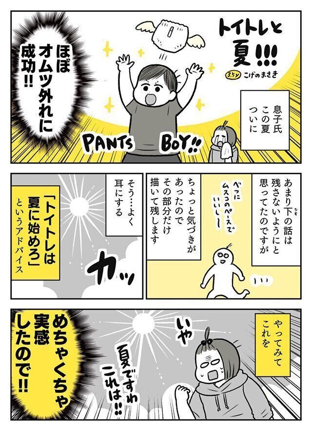 こげのまさき「7月頃の突然の暑さが良いきっかけになった気がします。本人もオムツが『あつい!』と言っていましたし(笑)! まだできなくてもいいかなと思っていたので、いつの間にかできるようになっていたことに驚き、成長に感動しました!」