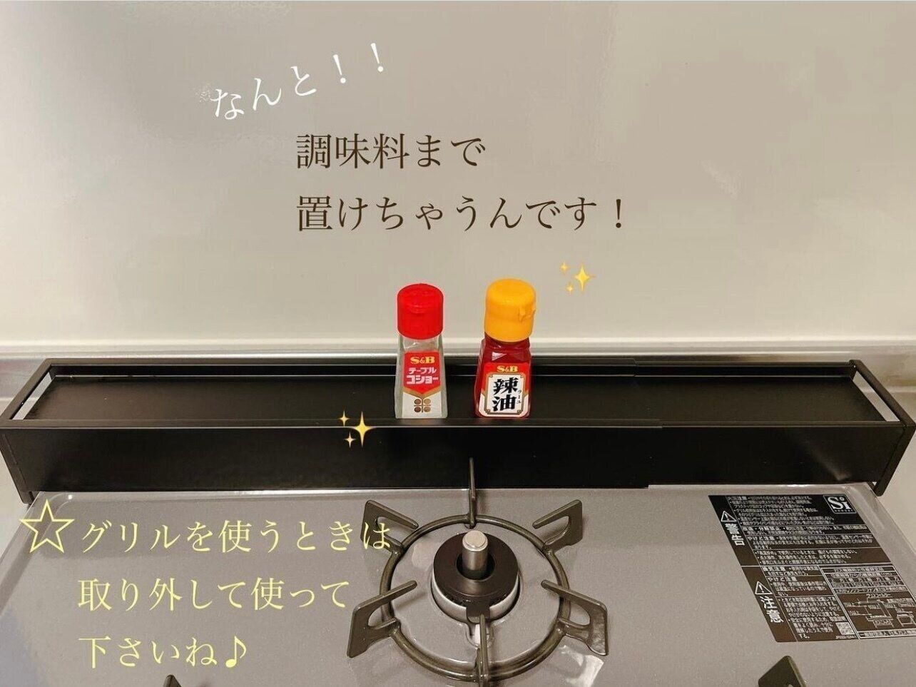 k.h___coupleさんがニトリで購入したのは「棚付き伸縮排気口カバー」。こちらをガスレンジに設置してから、油ハネや野菜くずなどでの汚れ掃除がしやすくなったみたいです。伸縮式なので幅が変えられて、カバー上には調味料も置けるようですよ。こちらは1,990円商品のようです。