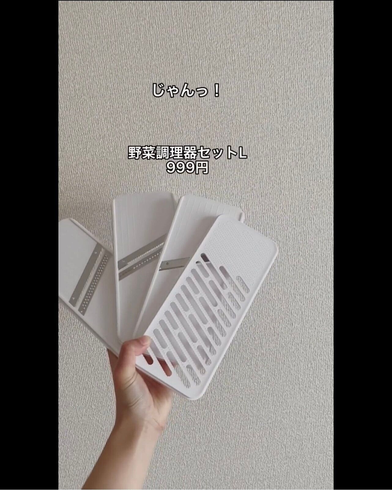 ニトリマニアさんがニトリで購入したのは野菜調理器セットです。このセットだけで千切り・スライス・おろし・ツマ切りができちゃうんだそう。ガード付きだから安心して使えて、付属の蓋で密閉すればそのまま保存容器にもなる万能さ!こちらのLサイズは999円商品のようです。