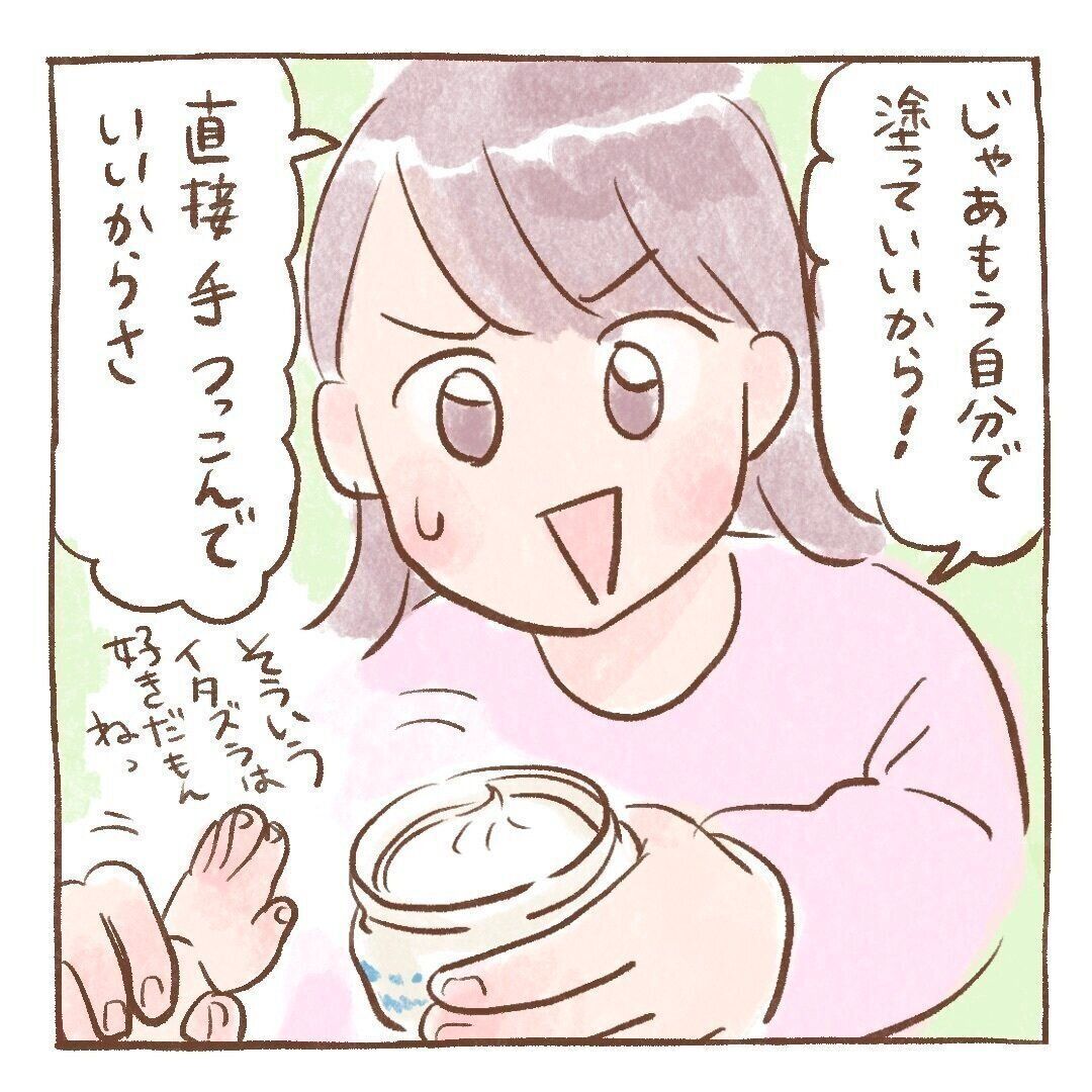 保湿剤で遊ぶのは好きだけど、顔に塗られるのはイヤなほぺちゃん。