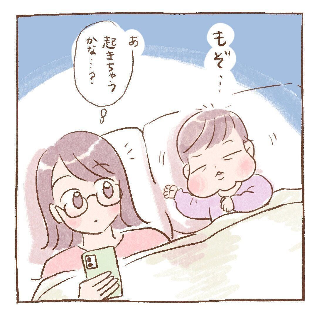 まだ眠くない私がスマホを見ながらゴロゴロしていたら、隣に寝ていたほぺちゃんがうっすらと目を開けて…。