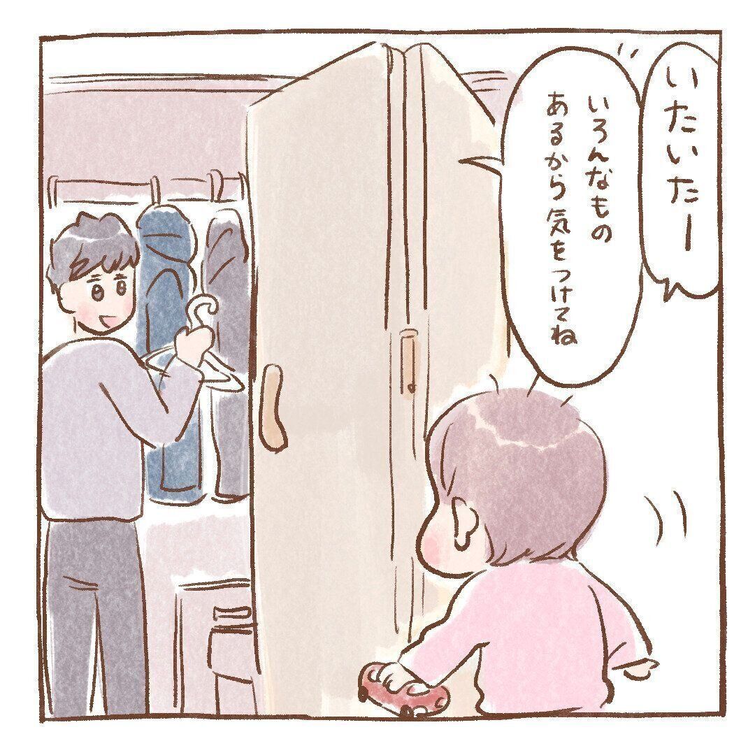 物がひしめく狭い空間にはちょっとした秘密基地感がただよっており、パパがそこにいるとほぺちゃんも喜んでくっついて行くのですが…。