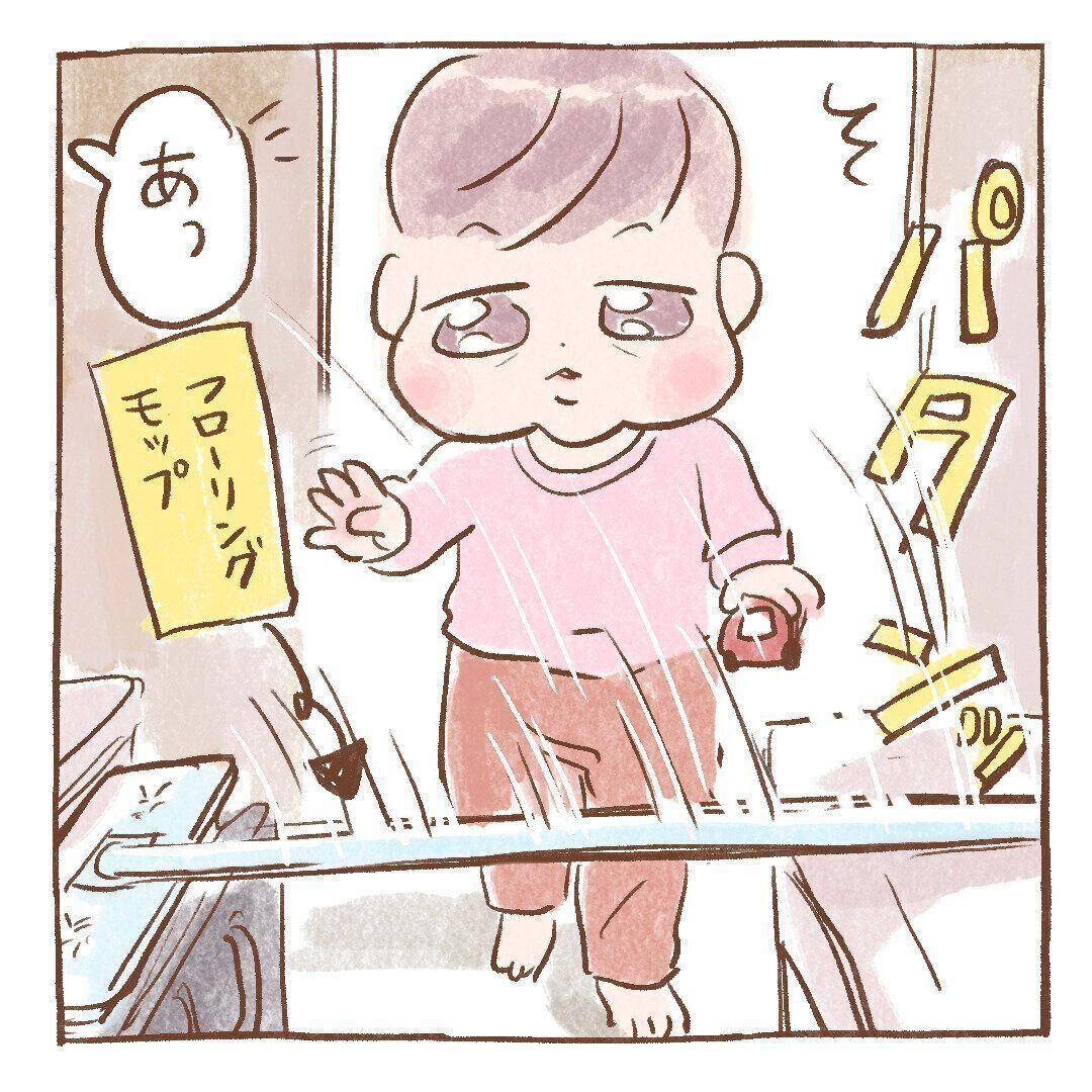 立てかけてあったお掃除モップがパタンと倒れ、ほぺちゃんの通路をふさいでしまいました。
