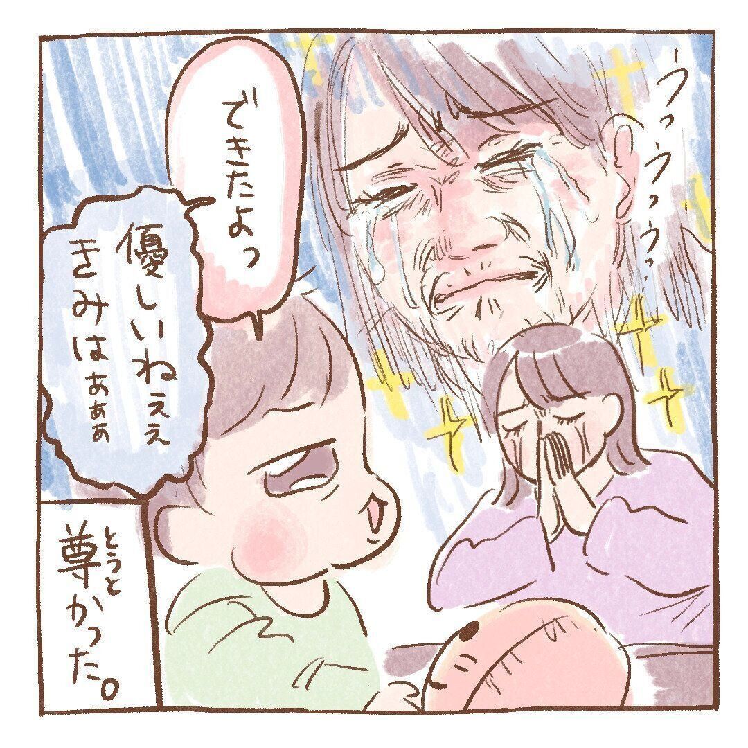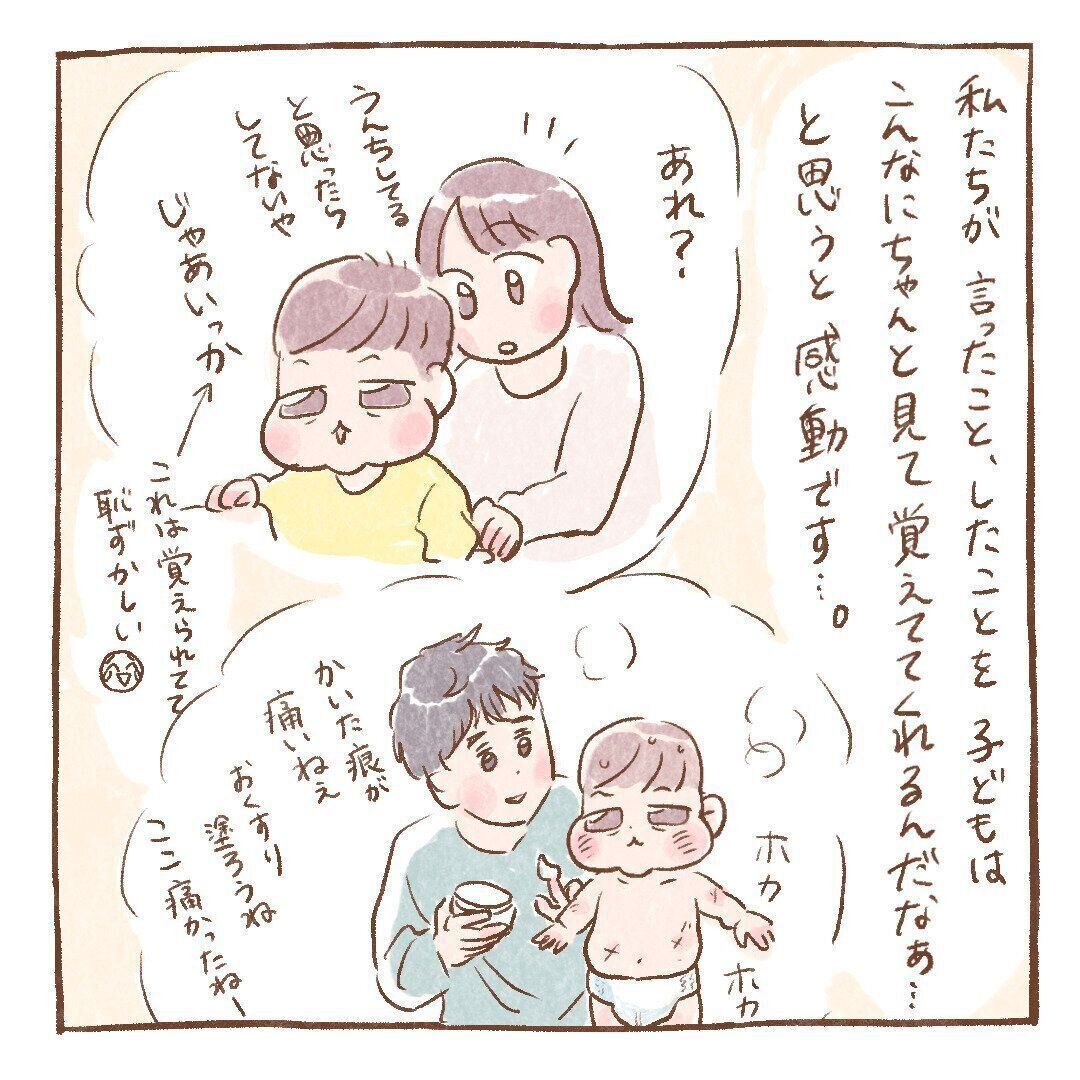 ところで、ほぺちゃんはよく私の顔に保湿剤を塗ってくれたり、「ママ、おけしょうするー!」と言いながらメイクブラシで顔をなでてくれたり(力加減は強くて笑ってしまう)、お風呂で私の髪を流してくれたりします。