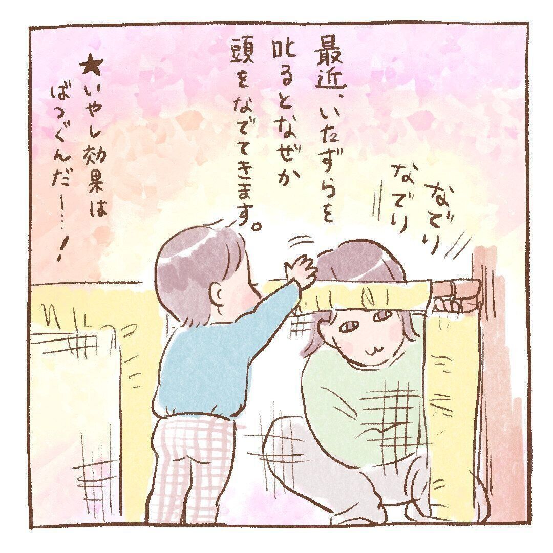 その後もいたずらにぷりぷり怒ってみせたら、なでなで…と優しく頭をなでてくれたほぺちゃん…。