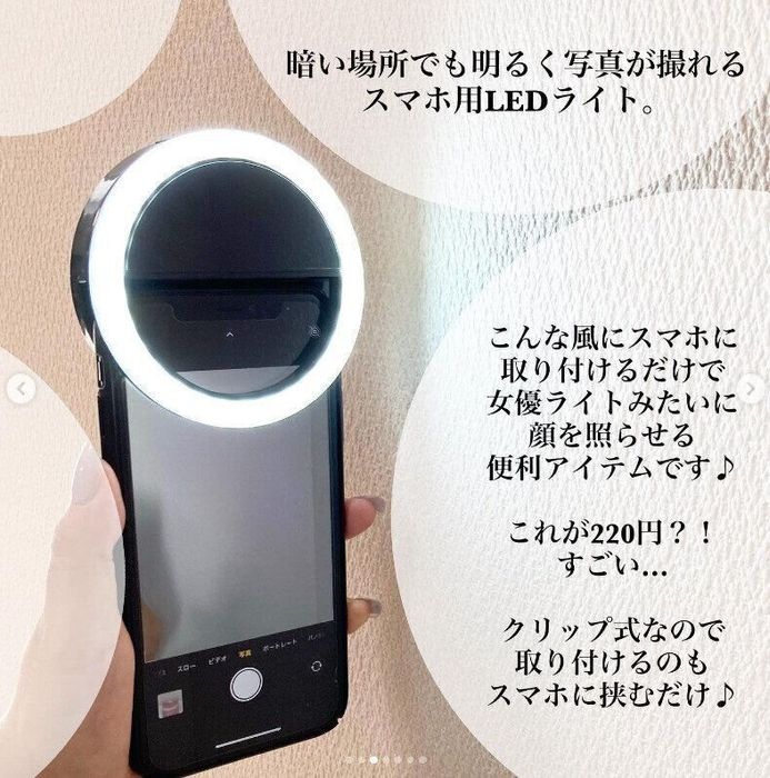 ぺりさんのおすすめアイテムはスマートフォン用のセルフィーライト。こちらは220円商品です。クリップでスマホに取り付けるだけで、女優ライトのように顔を明るく照らしてくれるというこのアイテム。この方はインスタグラムに載せる商品を明るく照らして撮影するために、ライトを外側に向けて装着して使っているそうです!