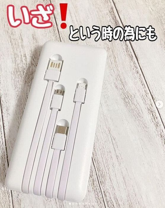 lairu.fashionさんが1,100円で購入したのはケーブル一体型モバイルバッテリー。4種類のケーブルがバッテリーと一体になっており、さまざまな種類のスマホやゲームの充電に対応しているアイテムです。1つあったらとても便利で、停電時にも活躍しそうとのことですよ!