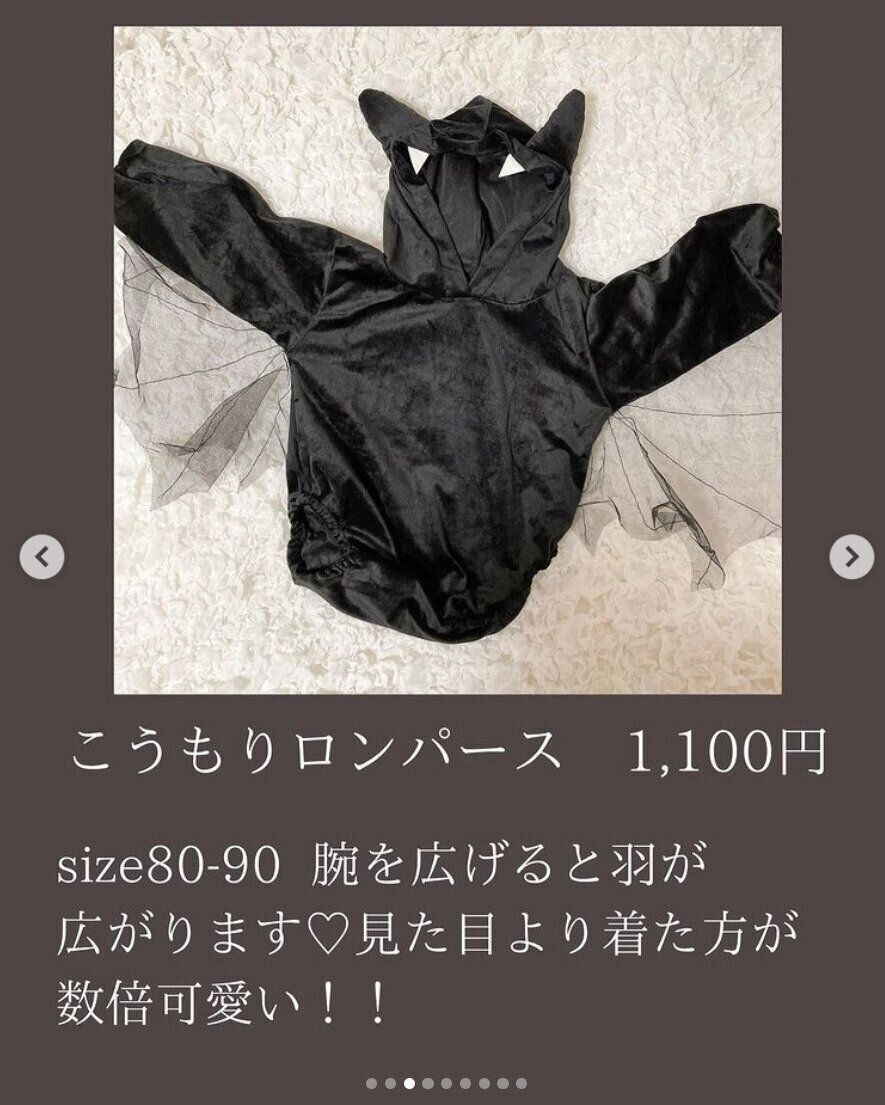 こちらはhuey_gramさんが3COINSで購入した「こうもりロンパース」。80〜90サイズで、腕をあげると羽が広がるんだとか。実際に着せてみたらとってもかわいかったそうです。ハロウィンが待ち遠しくなりますね♪ こちらは1,100円商品とのこと。
