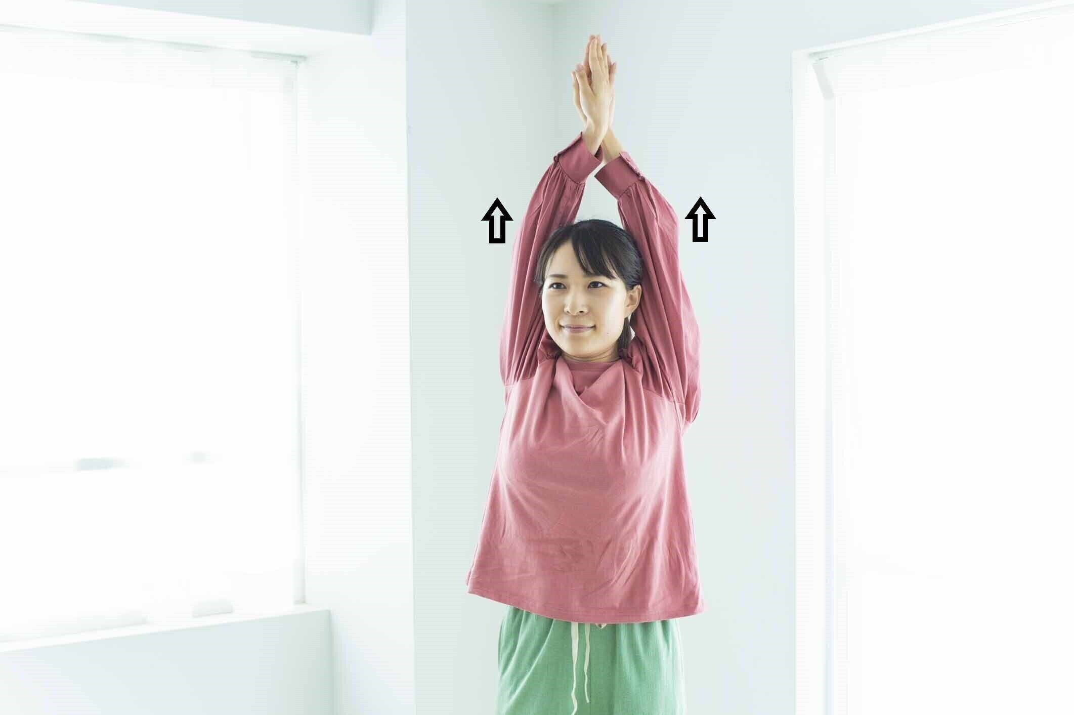 交差させた腕を、そのまま頭上に上げていき、耳の後ろの位置で10秒キープします。