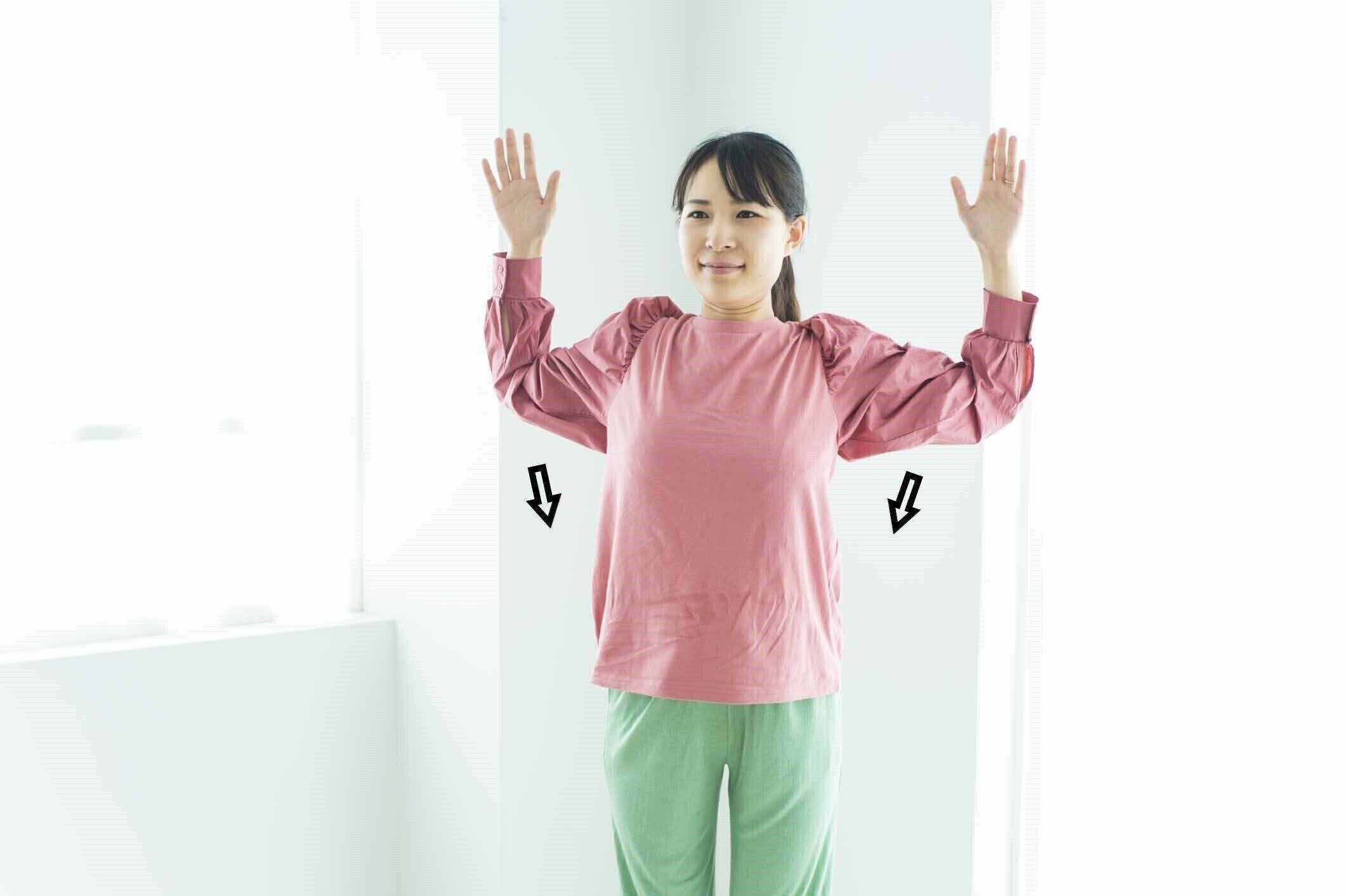 3)肩甲骨を寄せながら腕を下ろす