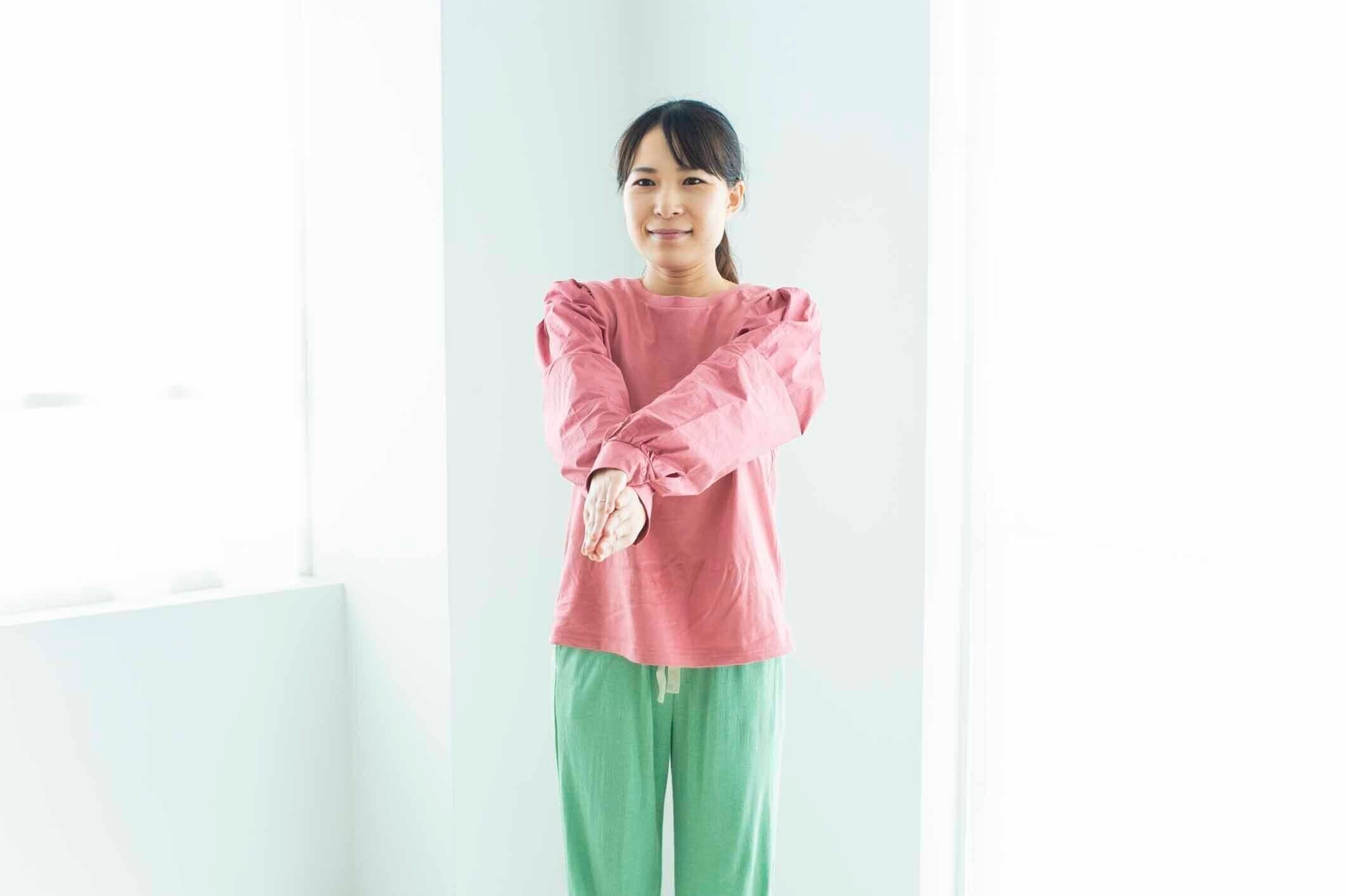胸の前に腕を伸ばします。左右の腕を交差させて、左右の手のひら同士を合わせます。
