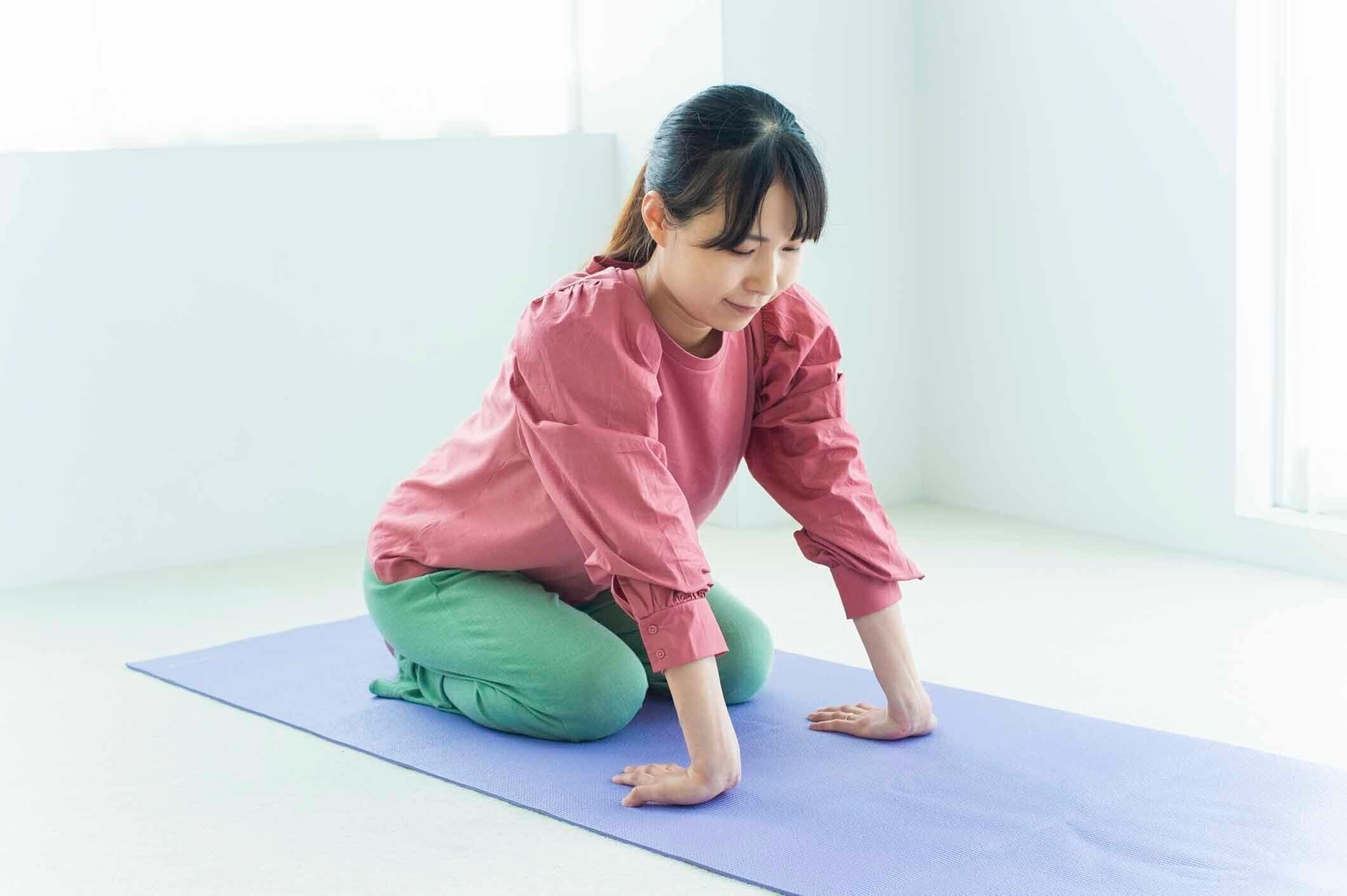 まず、正座の姿勢から、床に腕をつき、息を吸います。このとき、腰が反らないように注意しましょう。