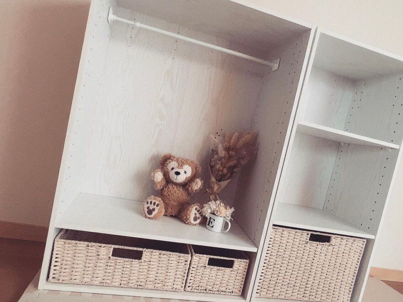 asahi___.0901さんはニトリのカラーボックスをベビーグッズ収納として使う予定のようですよ。突っ張り棒を取り付けたのでハンガーもラクラク収納できますね。下段のボックスもニトリの商品みたいですよ。