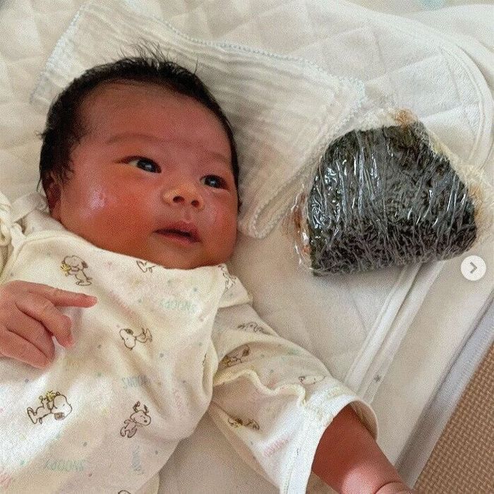 赤ちゃんとおにぎりとの比較がなんとも微笑ましいショット
