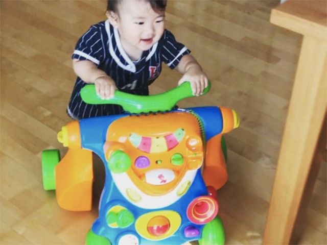 お子さんが11カ月のときに遊んでいるようすをおさめたムービー。よちよちとつかまり歩く姿がなんともキュート。正面のボタンから音が出る仕掛けも、赤ちゃんの心をぐっと掴みます! 1才3カ月になった今はしっかりまたがって遊んでいるそう♪