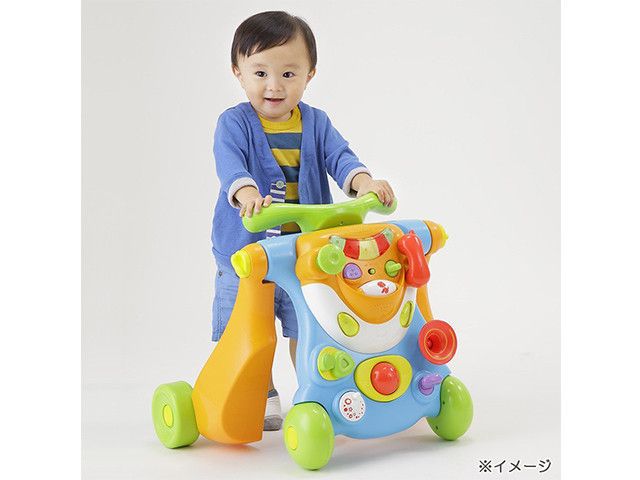 子どもの成長に合わせて、ベビーウォーカーがライドオンにチェンジするという一石二鳥のおもちゃ! 押したり、回したり、ひねったり、おもしろい指遊びが楽しめちゃいます。メロディと動物の鳴き声を選べたり、おもちゃの電話もついているから、赤ちゃんも興味しんしん!