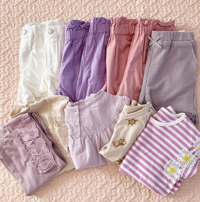 セール価格に衝撃を受けたというなりちゃんさんは西松屋セールでまとめ買い!トップスは99円(税抜)、ボトムスは199円~299円(税抜)だったそうで、驚きの安さですよね!ピンクや紫系統で揃えているのがおしゃれですね♪