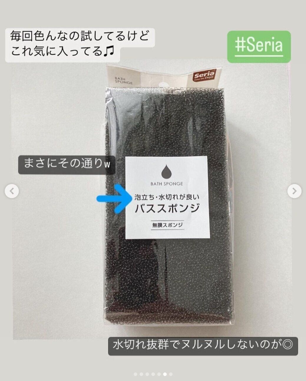 mikaさんがヘビロテしている水回り掃除アイテムはセリアのバススポンジ。泡立ちや水切れがとても良く、ヌルヌルしないのがお気に入りポイントだとか!100均で優秀アイテムが買えちゃうのは嬉しいですよね♪