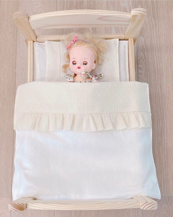 こちらはIKEAで購入できる人形用ベッドです。ドール遊びにあるとうれしいおもちゃの一つですよね。こちらのお布団はもともと付属されていた物をMIWAさんがリメイクしたんだそう。ベッドをカラーリングしたりしてさらにオリジナリティを出すのも良さそうですね。