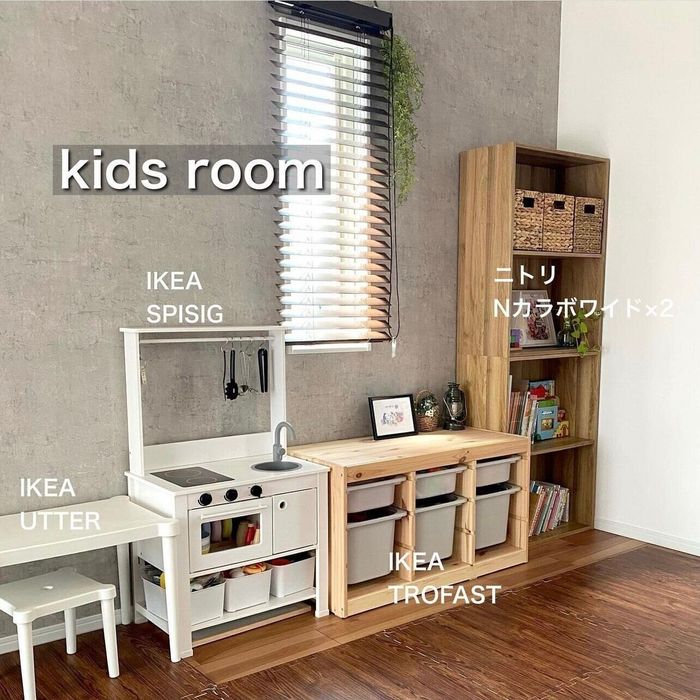 hinakoさんがキッズルームに導入したのはIKEAのおままごとキッチンです。ホワイトを基調としたカラーリングはどんなお部屋のインテリアとも合わせやすいですよね。横に並べた同じくIKEAの収納棚が同じくらいの高さなので並べると作業スペースが増えて遊びやすいんだそう。目の前が板張りされていないので、キッチンを挟んで対面しながらも楽しめますね。