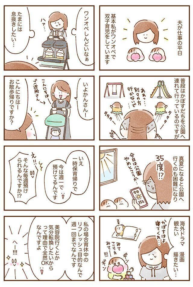 双子育児で1番しんどかったと話してくれた産後の夜間授乳。2人分の授乳やオムツ替えなど、24時間休む間もなくお世話するのを想像するだけで頭がクラクラしちゃいます。今では週に1回の一時保育を利用しながら上手に息抜きしているようでした。