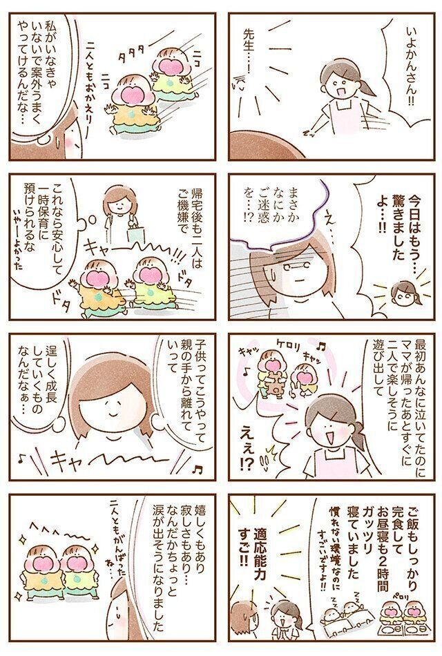 いよかん「2歳前から一時保育を利用し始めました。慣らし保育では2人ともギャン泣きだったので『大丈夫かな……?』と心配していましたが、すぐに慣れたようでホッとしました。一時保育に預けることで漫画を描いたり、美容院や病院の予約をしたり買い物に行ったり、貴重な1人時間を確保できて本当に助かっています…!」